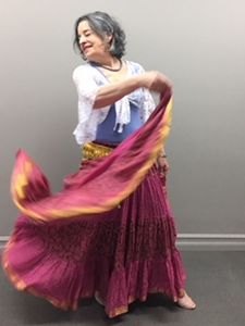 My name is Diane I grace my sixties with suppleness, rhythm, and movements. I thought I would never be able to do, I am improving my flexibility, balance and coordination, I enjoy dancing with a veil, a cane, wide skirts and mantilla.